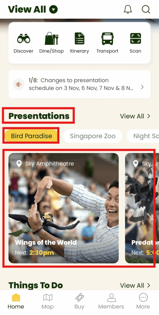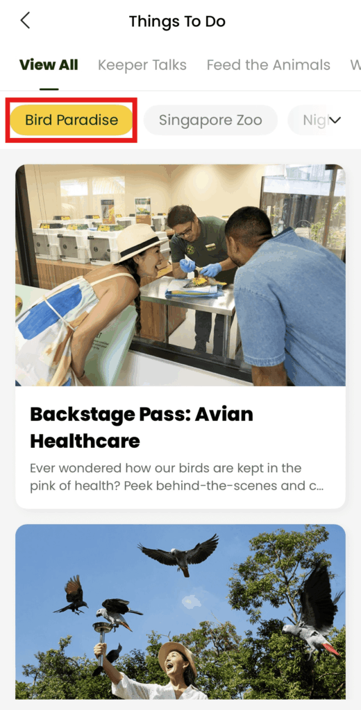 ホーム画面からは、「バードパラダイス」にフィルターをかけることで、次に実施されるショーの時間や内容を確認することができます。