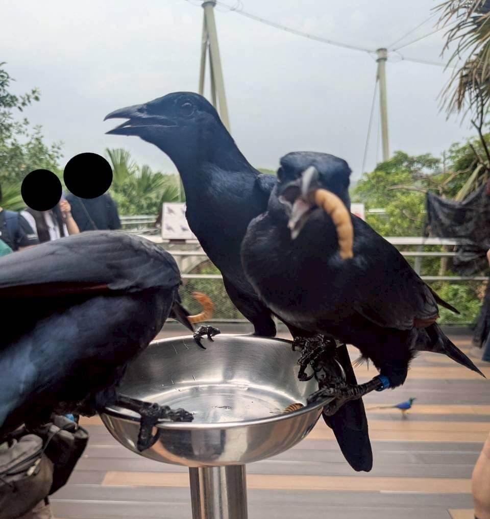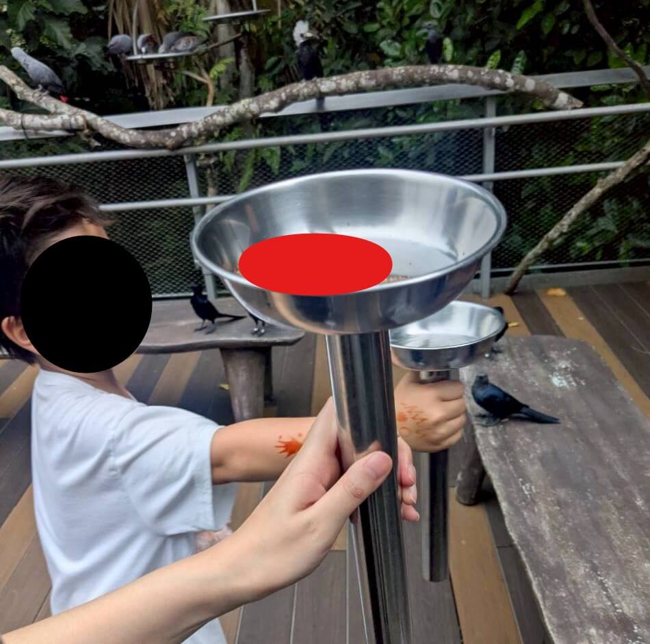 決められた時間に各所で餌やり体験が行われています。餌やりは 8 SGD追加でかかります。今回せっかくなのでチャレンジしてみました!(鳥の種類によってやり方は異なると思われます。)