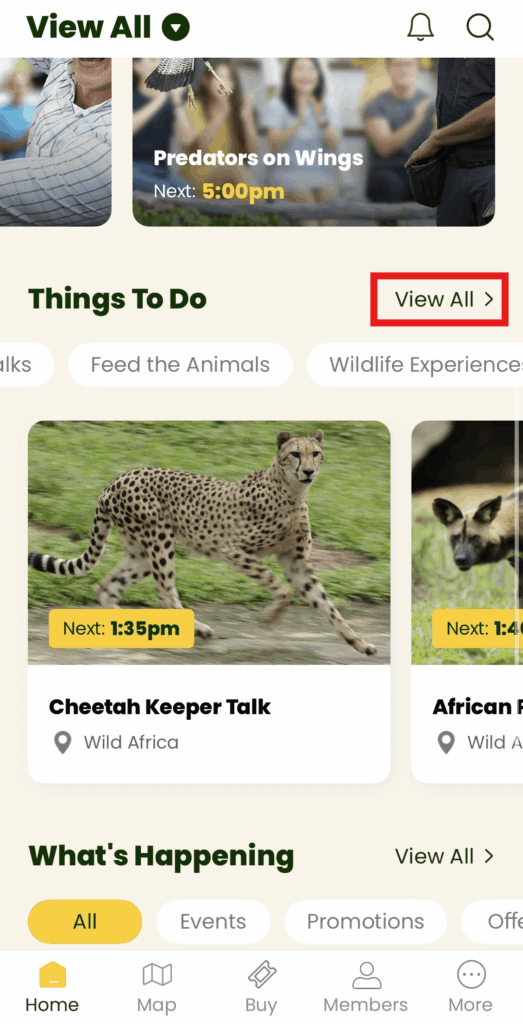 また、「Thing to Do」の項目からは、餌やり体験や飼育員に話を聞けるのアクティビティなどの実施時間を確認することができます。