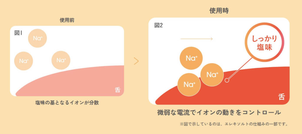 記載から、エレキソルトは微弱な電流を使用して塩味の基を舌に集めることで、食材に含まれている塩味をより多く舌に伝える(=味が濃く感じる)ことができるとのこと!同じ塩の量で、より強く塩味を感じることができるのが特徴です。