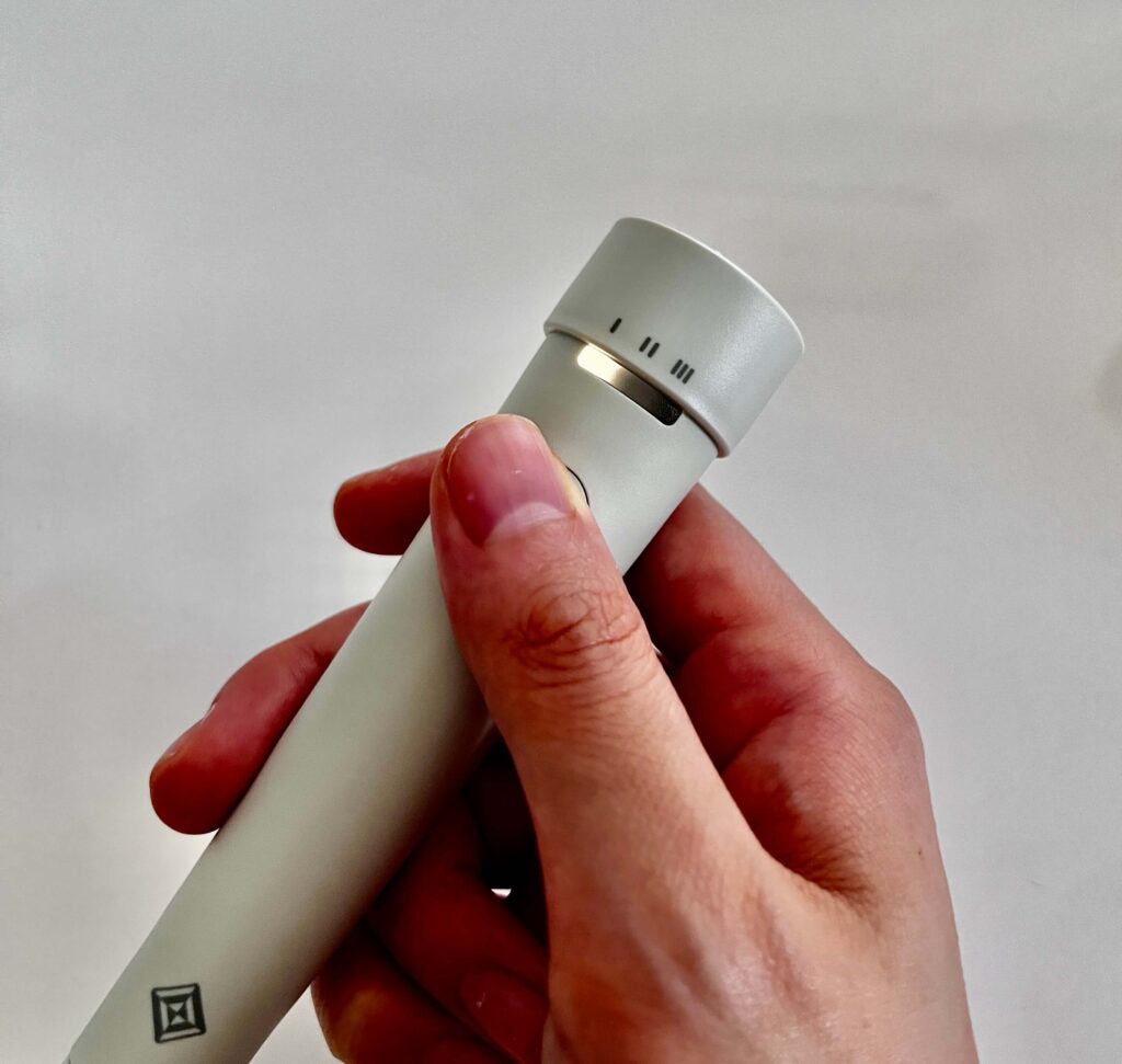 持ち手のボタンを押すと、電流が流れ始めます。流れる電流の強度は3段階。食事をする中で、物足りない場合は強度を徐々に上げていきます。