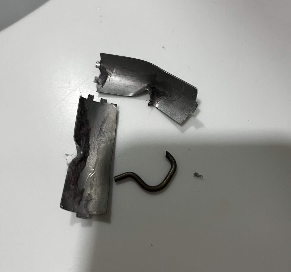 2回目は、洗濯機で乾燥中に内部から金属音が。気になって洗濯機を止めなかを開けると、洗濯機に埃が混じり、なかから見たことがない金属パーツが、、