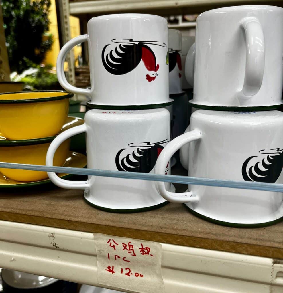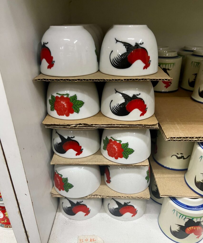 陶器だけでなく、ステンレスのカップなどもありました。また他にはない鶏柄のお茶入れ?もありました。