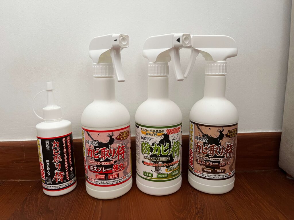 そんなカビの救世主が「カビ取り侍」!一度日本に戻った際に「強力タイプ(赤ラベル)」「木材・畳向け(茶色ラベル)」「水性タイプ(緑ラベル)」「ジェルタイプ 防カビ剤入り(黒ラベル)」の4種類を調達し、各所に振りまいたところ、その場所だけ見事にカビがなくなりました…!本当におススメです!